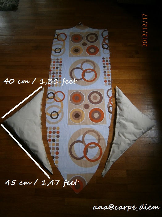 Prvo sam krenula u potragu za odgovarajućim dezenom, trebalo mi je nešto na točkice, tako da oponaša kromatofore - pigmentirane stanice na tijelu lignje. Ovaj materijal mi je bio nekako najbliži onome što sam zamislila. Kad je to bilo rješeno, od papira sam napravila kroj. Nastojala sam da što više sliči našoj domaćoj lignji, pa se dosta razlikuje od onog kroja iz posta koji sam spomenula. Dimenzije možete vidjeti gore, a one su ispale takve slučajno; dala sam si malo umjetničke slobode :D . Dakle, za tijelo lignje potrebno je iskrojiti gornji i donji dio, jer to će biti jastuk na kraju.